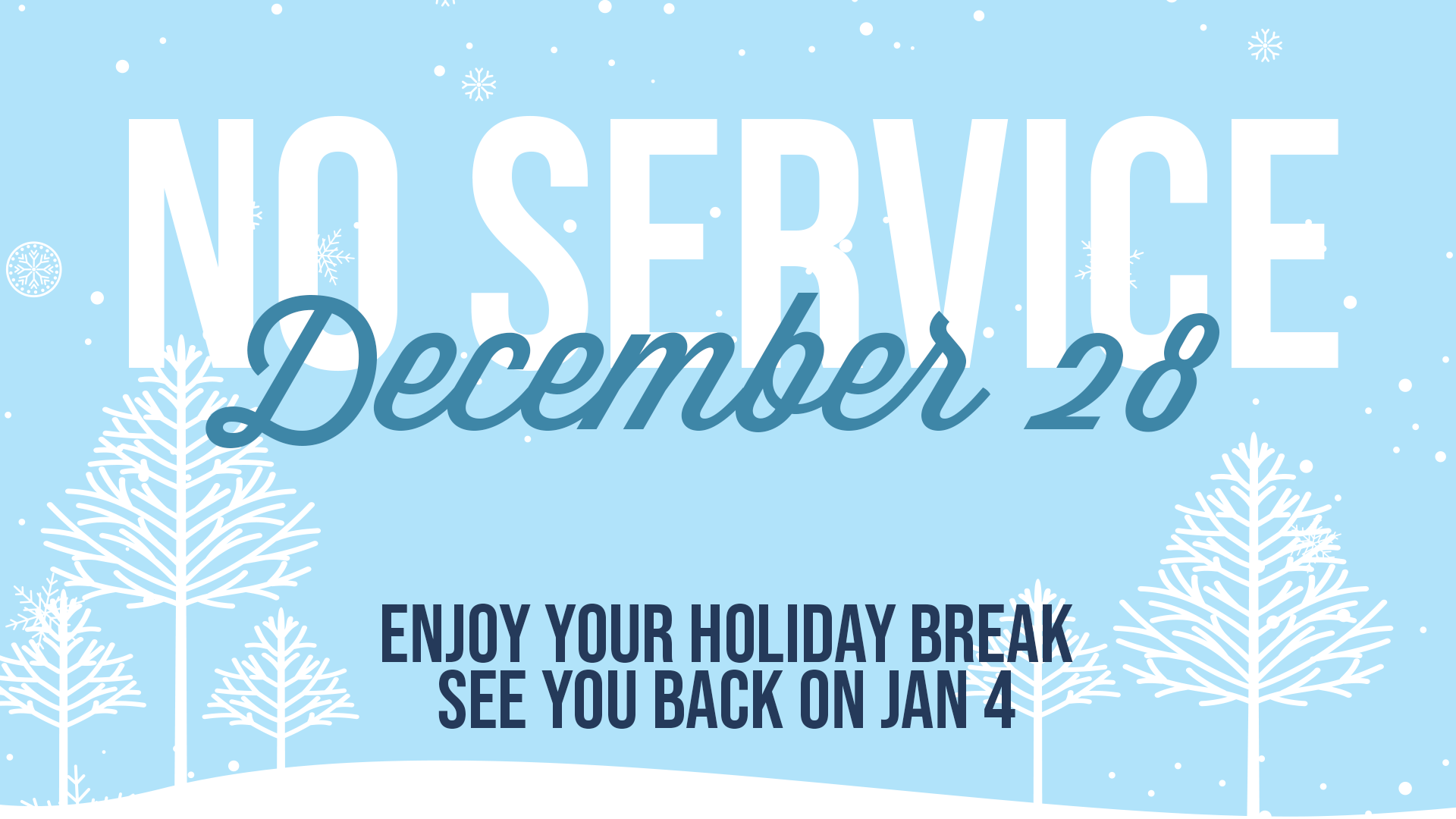 Enjoy a morning off from our regular Sunday service as there is no service on December 28th. We hope you enjoy the day with family and continuing to celebrate Jesus' birth.