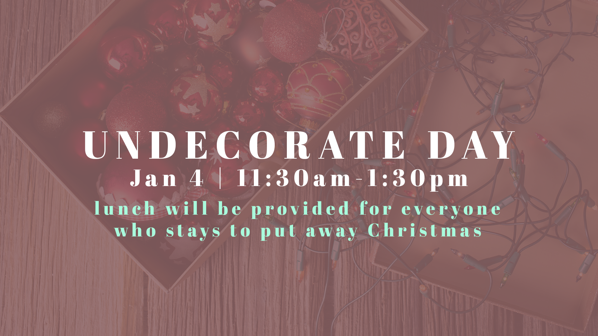 Following the Encounter Sunday service is our Un-Deck The Halls afternoon. Help us clean and put away all of our Christmas decorations and reset the church fresh for the new year.